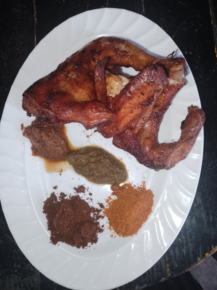Savourez notre poulet flambé parfaitement épicé, accompagné d'un assortiment de piments (pâte et en poudre) savoureux. Idéal pour un repas familial ou amical, ce plat allie le goût intense de la braise à des épices authentiques pour une expérience culinaire inoubliable.