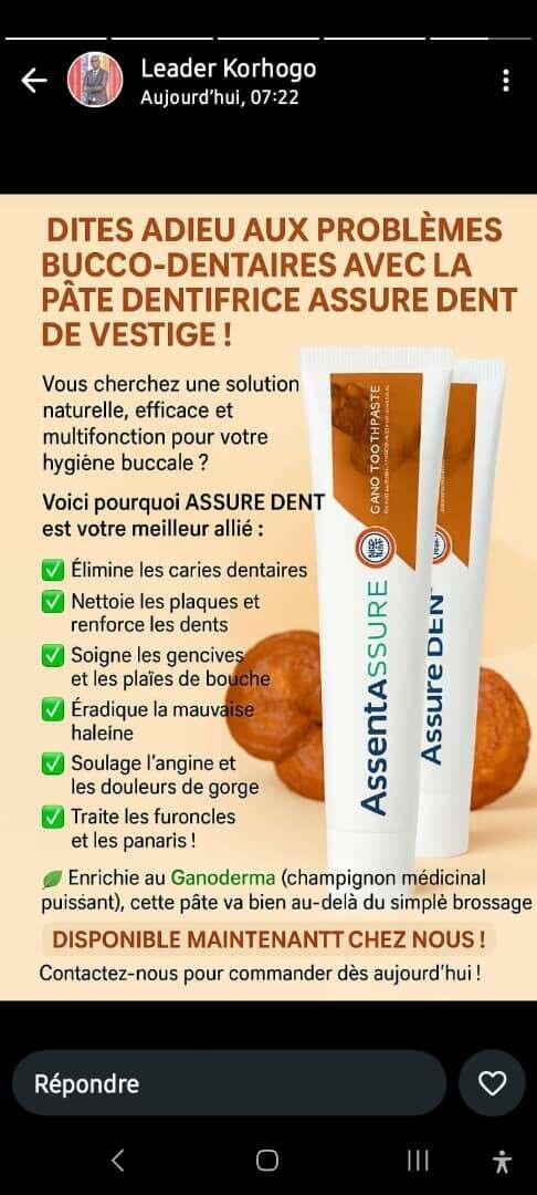 Découvrez le pouvoir du dentifrice Assure Dent. Sa formule enrichie élimine la plaque, renforce les dents et soulage les gencives. Idéal pour une hygiène buccale complète et nettoie le côlon.
