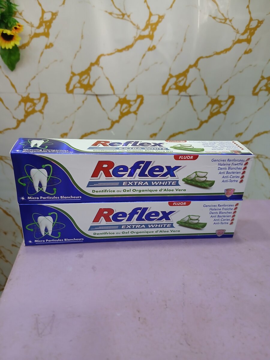 Découvrez le dentifrice Reflex , enrichi en pâte organique tet Aloe Vera pour des dents plus blanches et saines.