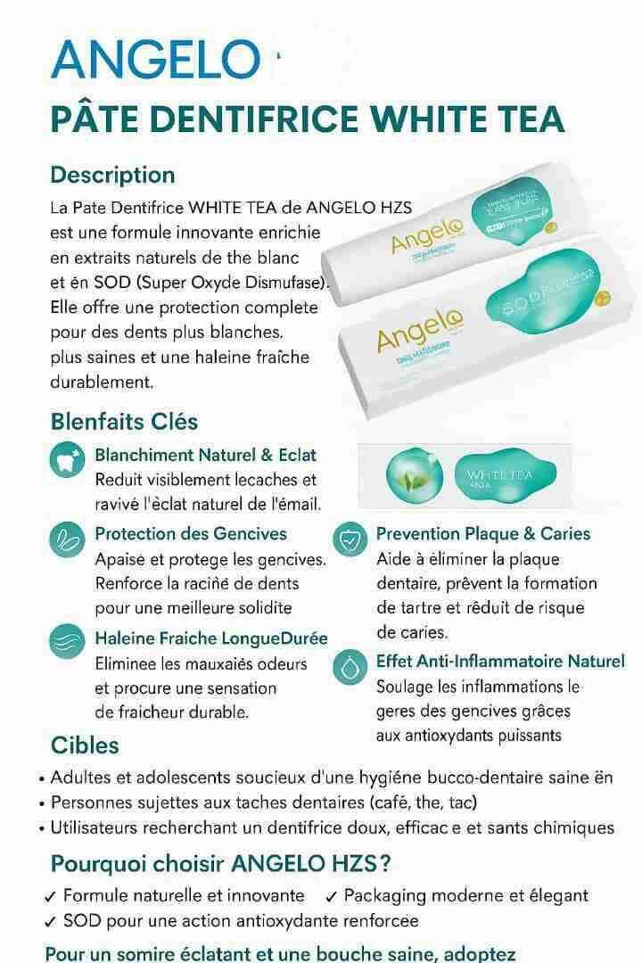 Découvrez le dentifrice Tea, enrichi en extraits naturels de thé blanc. Il offre une protection complète pour des dents blanches et un sourire éclatant. Sa formule renforce les gencives et prévient les caries. Parfait pour toute la famille!