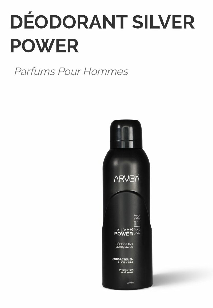 Le déodorant Silver Power Men dARVEA est conçu pour homme. Sous forme daérosol, Il combat les bactéries et neutralise les mauvaises odeurs corporelles grâce au citrate dargent qui est un agent antibactérien compatible bio, ayant subi un procédé de production respectueux de la santé humaine et de lenvironnement.