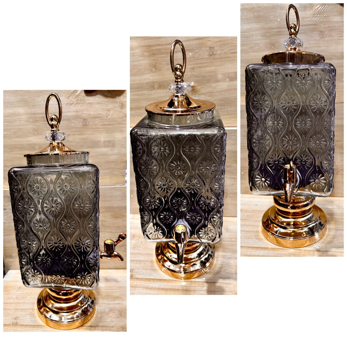 Élégant distributeur de boissons en verre avec détails dorés. Parfait pour les événements spéciaux ou l'usage quotidien. Idéal pour servir des boissons fraîches avec style. Capacité spacieuse et robinet pratique pour un service facile. Apportez une touche d'élégance à vos rencontres familiales et fêtes.