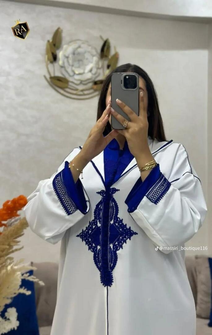 Découvrez cette djellaba blanche élégante avec des détails en broderie bleue. Confectionnée avec des matériaux de qualité, elle est parfaite pour les occasions spéciales ou pour ajouter une touche d'élégance à votre tenue quotidienne.