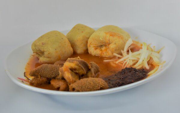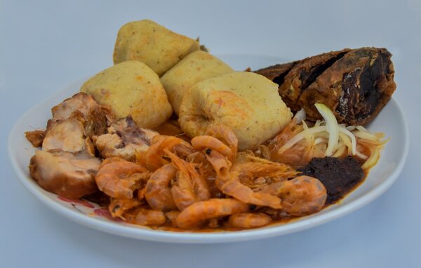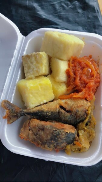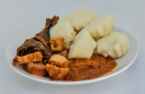 Savourez un délicieux repas africain avec du poisson frit croquant, des boulettes de manioc moelleuses et une riche sauce épicée. Idéal pour les dîners exotiques ou les repas en famille.