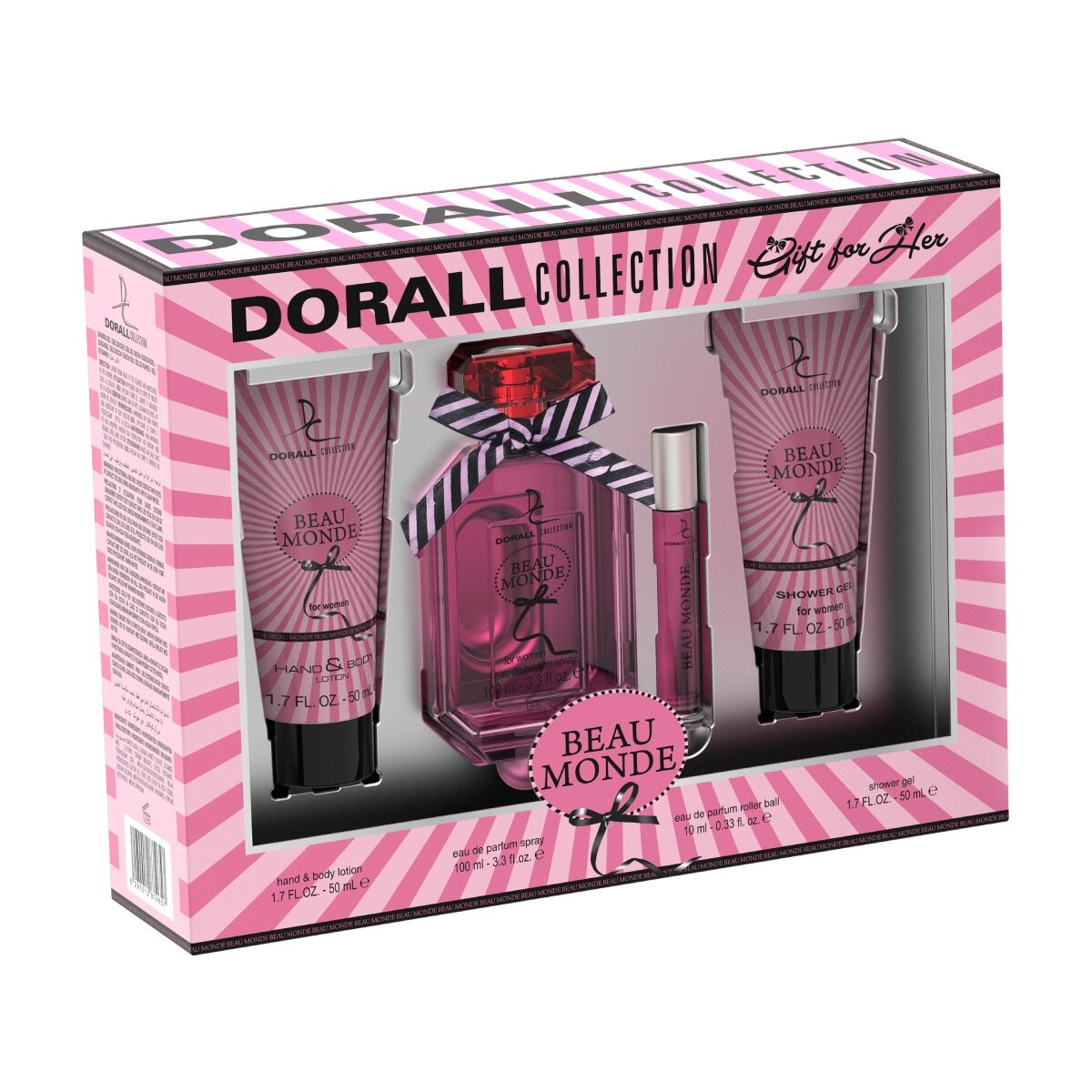 Contains a 100ml perfume, a pocket size body and hand cream, a pocket size shower gel and a pocket size 10ml perfume.