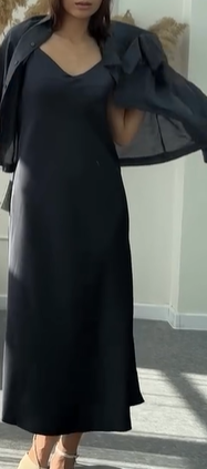 Очень красивый комплект: платье на регулируемых лямках, которое скрывает все недостатки благодаря материалу и выглядит дорого. Сверху идет рубашка из тонкого материала. Доступен в нескольких расцветках.
