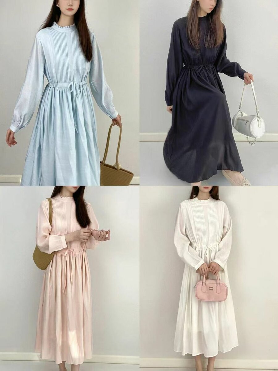 Платье в мягком стиле. Имеется язавязка на талии; длинные рукава с манжетами, воздушная ткань и универсальный фасон. Доступные цвета: голубой, чёрный, пудровый, белый