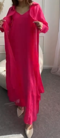 Очень красивый комплект: платье на регулируемых лямках, которое скрывает все недостатки благодаря материалу и выглядит дорого. Сверху идет рубашка из тонкого материала. Доступен в нескольких расцветках.