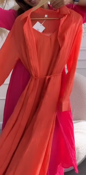 Очень красивый комплект: платье на регулируемых лямках, которое скрывает все недостатки благодаря материалу и выглядит дорого. Сверху идет рубашка из тонкого материала. Доступен в нескольких расцветках.