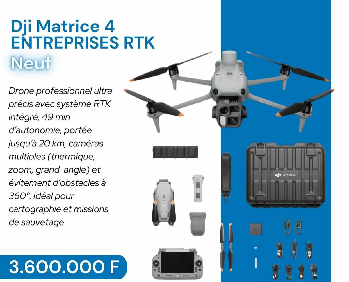 Drone professionnel pour missions avancées avec caméra thermique et zoom. Autonomie de 49 min et portée de 20 km. Équipé de système RTK pour une précision optimale. Parfait pour la cartographie et les sauvetages.