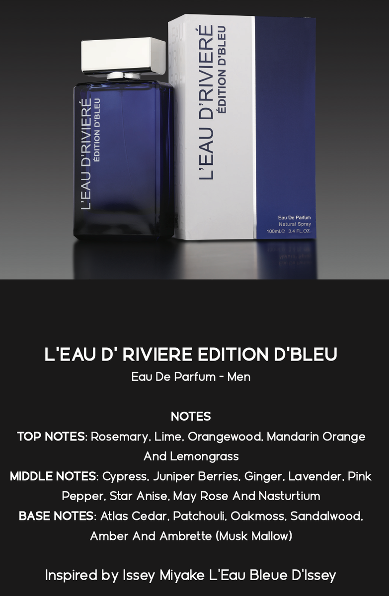 Découvrez l'élégance de L'Eau D' Rivière Edition D'Bleu, un parfum pour homme mêlant des notes de tête fraîches de mandarine et de romarin. Parfait pour une allure raffinée et séduisante.