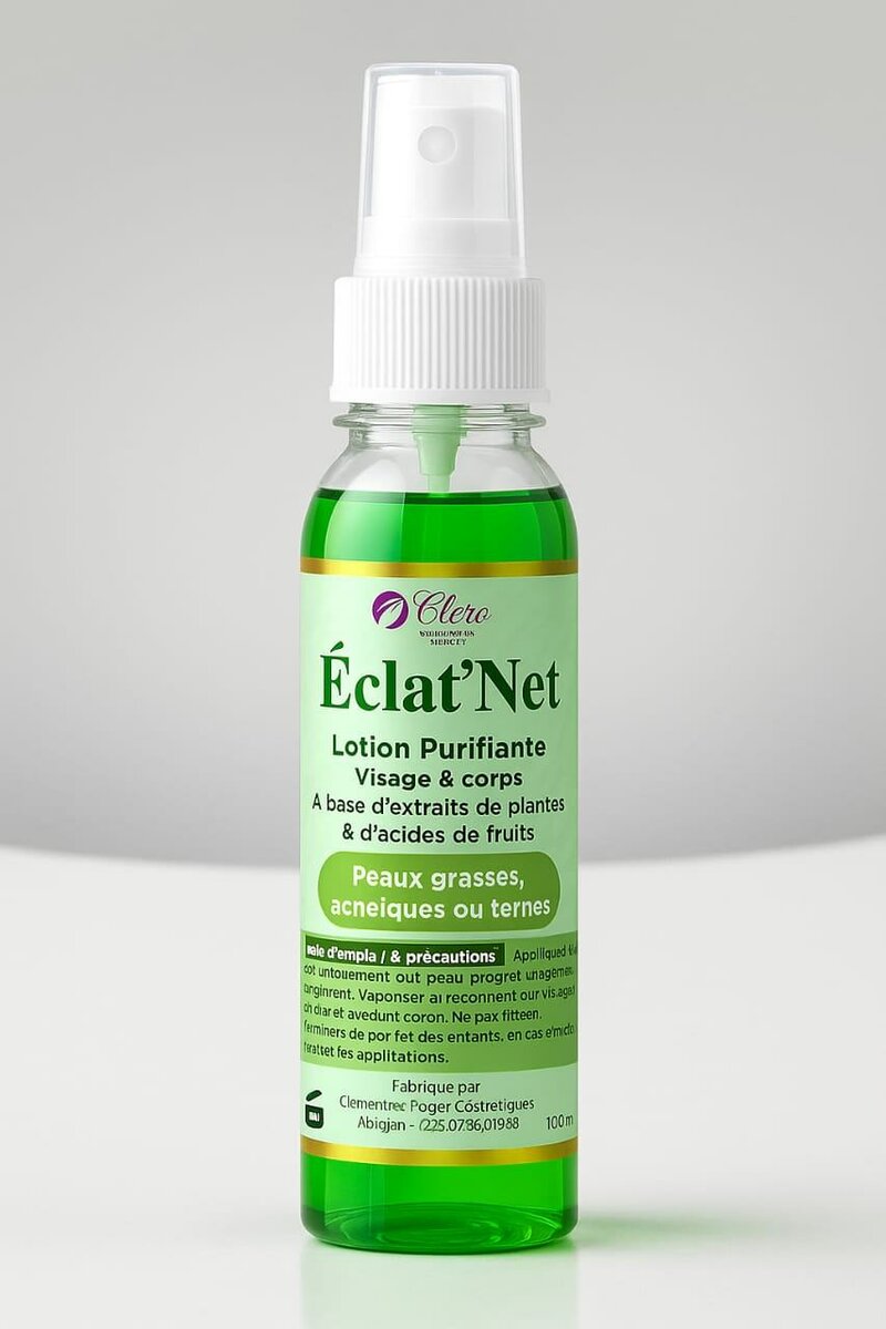 Découvrez la lotion purifiante Éclat'Net pour visage et corps, enrichie en extraits de plantes et acides de fruits. les peaux grasses, acnéiques ou ternes.