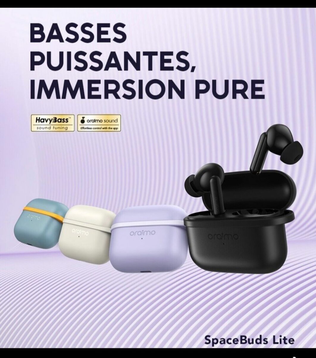 Profitez de 40 heures de musique non-stop avec les Oraimo SpaceBuds Lite. Immersion totale grâce à des basses puissantes et un son de haute qualité. Idéal pour tous les mélomanes cherchant confort et performance au quotidien.
