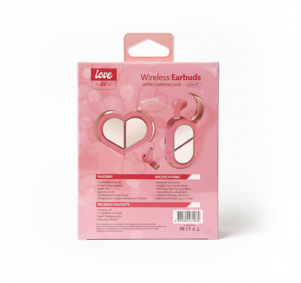 Découvrez les écouteurs sans fil Love avec étui de charge. Design en forme de cœur et son haute qualité. Parfait pour des cadeaux romantiques ou pour soi-même. Simple à utiliser et idéal pour la musique en déplacement.