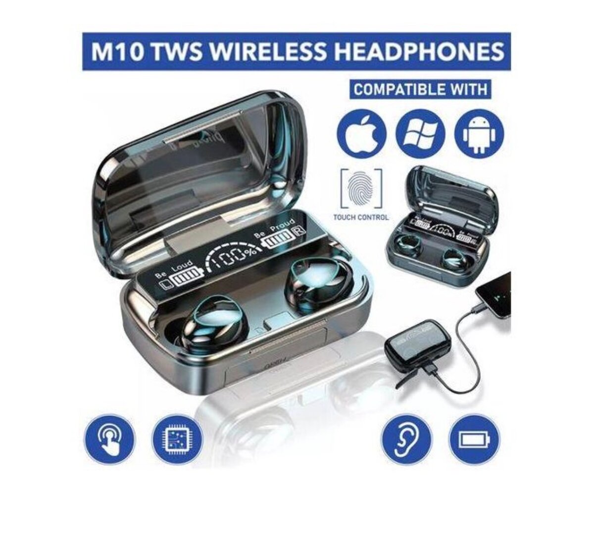 Découvrez les écouteurs M10 TWS avec chargeur intégré. Compatibles Apple, Android et Windows, dotés de contrôle tactile. Profitez d'une liberté totale de mouvement et d'une qualité sonore exceptionnelle. Parfaits pour la musique, les appels et comme batterie d'appoint pour votre téléphone. Idéal pour tous vos déplacements.