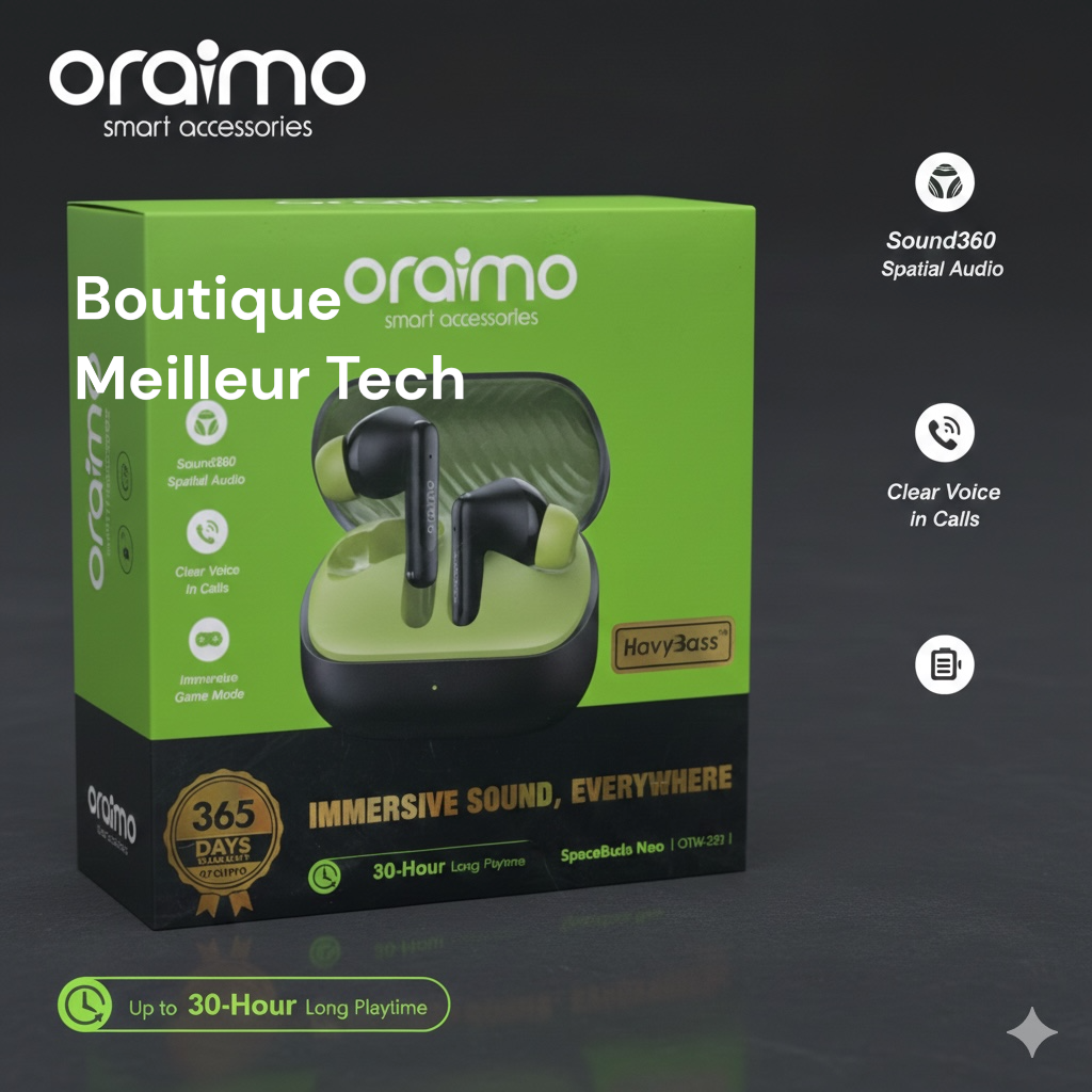 Découvrez les écouteurs sans fil Oraimo pour une expérience sonore immersive. Avec 30 heures d'autonomie, audio spatial Sound360 et résistance IPX4, ils sont parfaits pour le sport et le quotidien. Profitez de la clarté des appels et d'un mode jeu immersif. Compatibles avec l'application Oraimo Sound pour un contrôle facile. Idéal pour les passionnés de musique et les professionnels en déplacement.