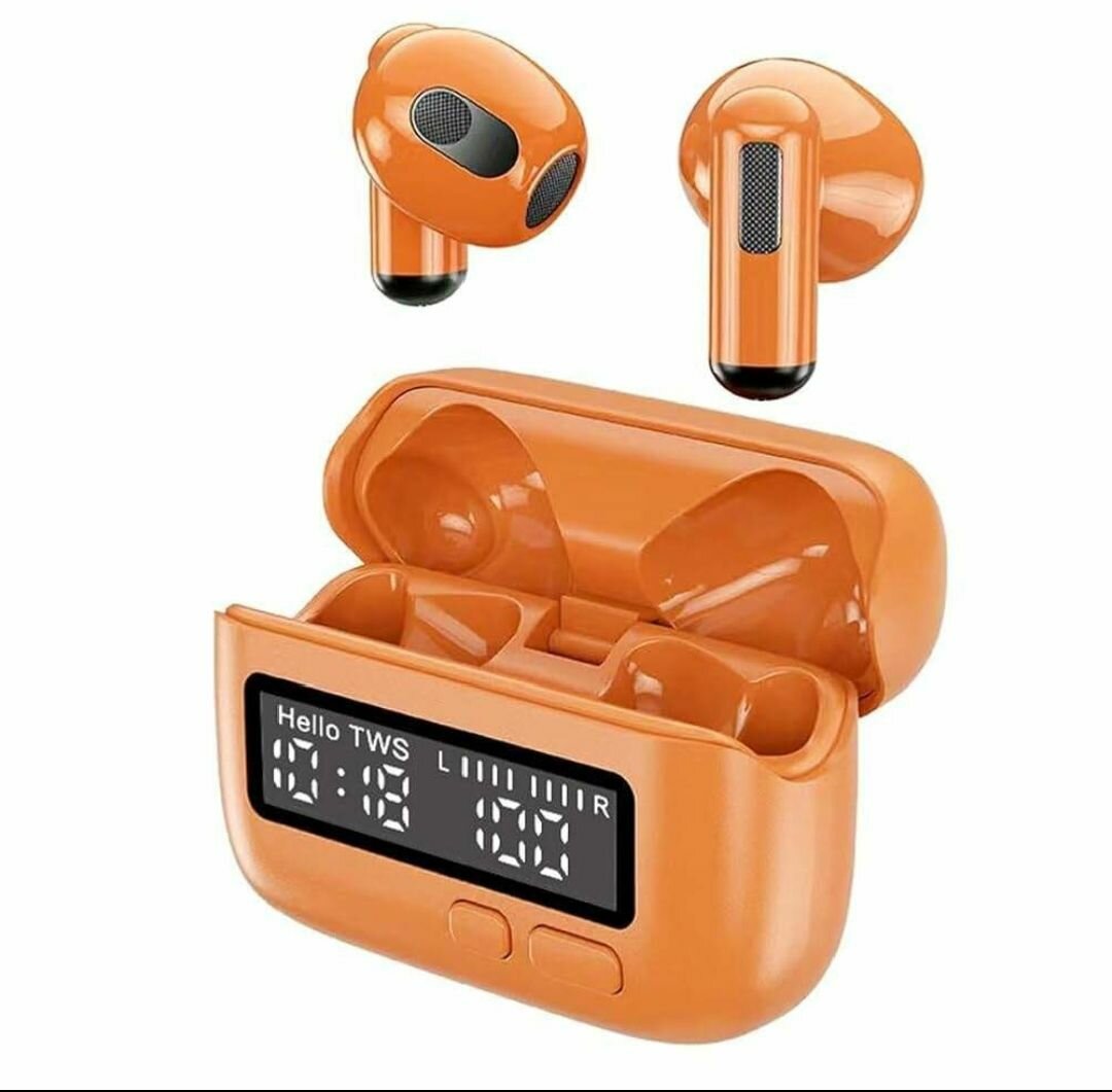 Découvrez des écouteurs sans fil TWS orange vif avec boîtier de charge et affichage numérique pratique. Parfaits pour votre usage quotidien, offrant un son clair et une connexion Bluetooth stable.