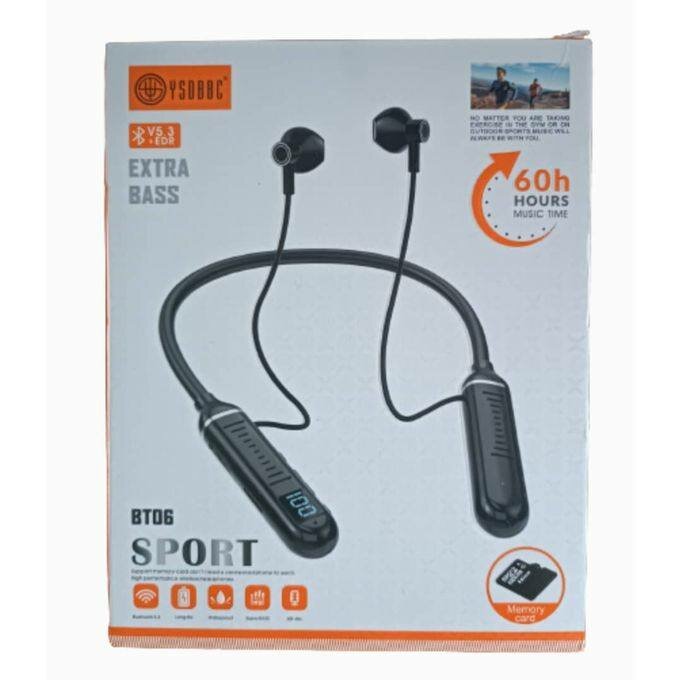 Profitez de 60 heures de musique sans interruption avec ces écouteurs BT06 sport au son extra bass. Parfaits pour vos séances d'entraînement ou pour une utilisation quotidienne. Compatible avec carte mémoire pour encore plus de musique à portée de main.