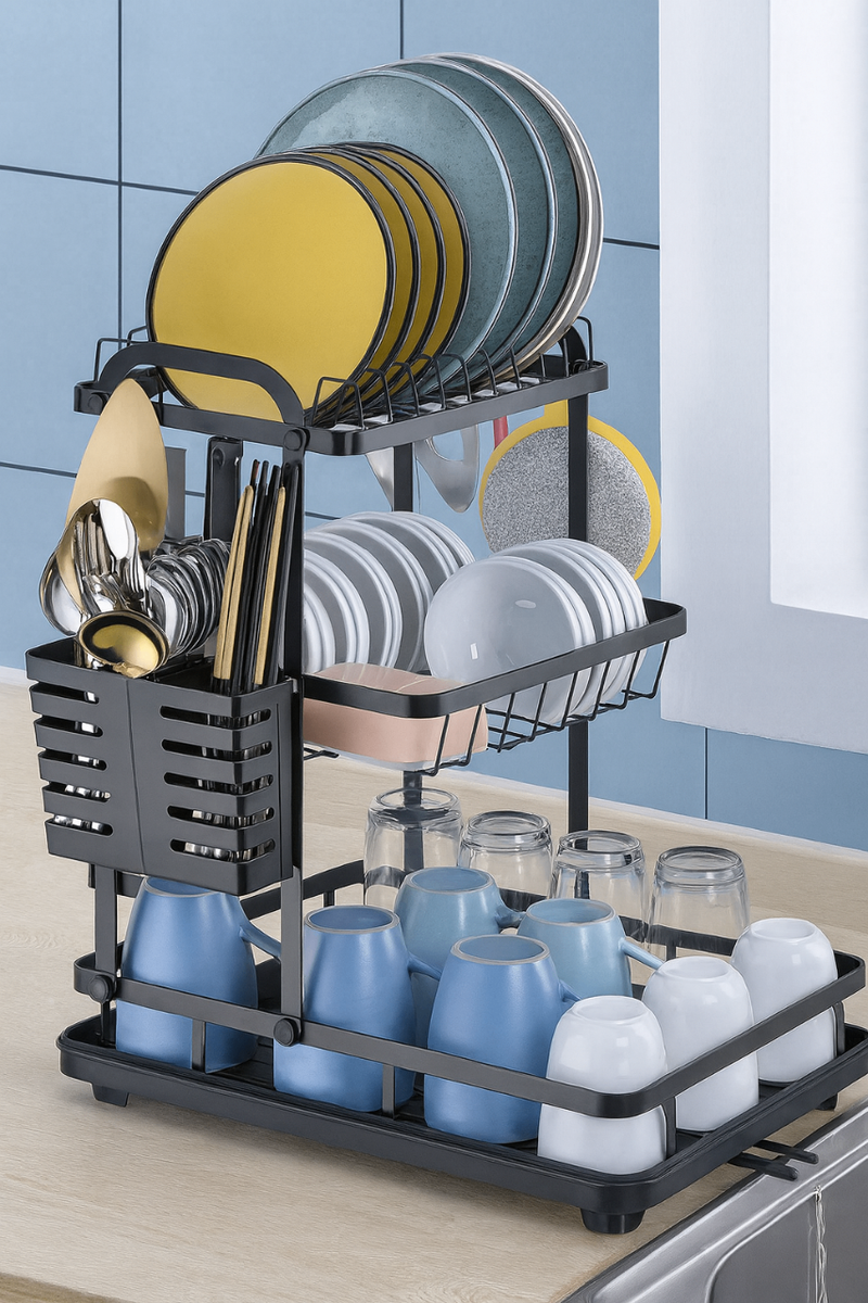 Optimisez votre cuisine avec cet égouttoir à vaisselle à 2 niveaux. Conçu pour accueillir assiettes, tasses et couverts avec un minimum d'espace. Idéal pour les cuisines modernes.