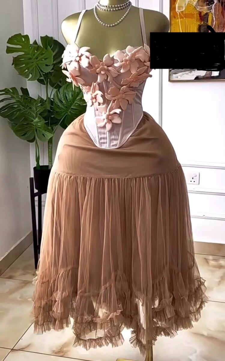 Discover timeless elegance with this exquisite floral dress. Crafted with a structured bodice adorned with intricate flower applique, and a flowing tulle skirt. Perfect for special occasions, it offers comfort and style in one.