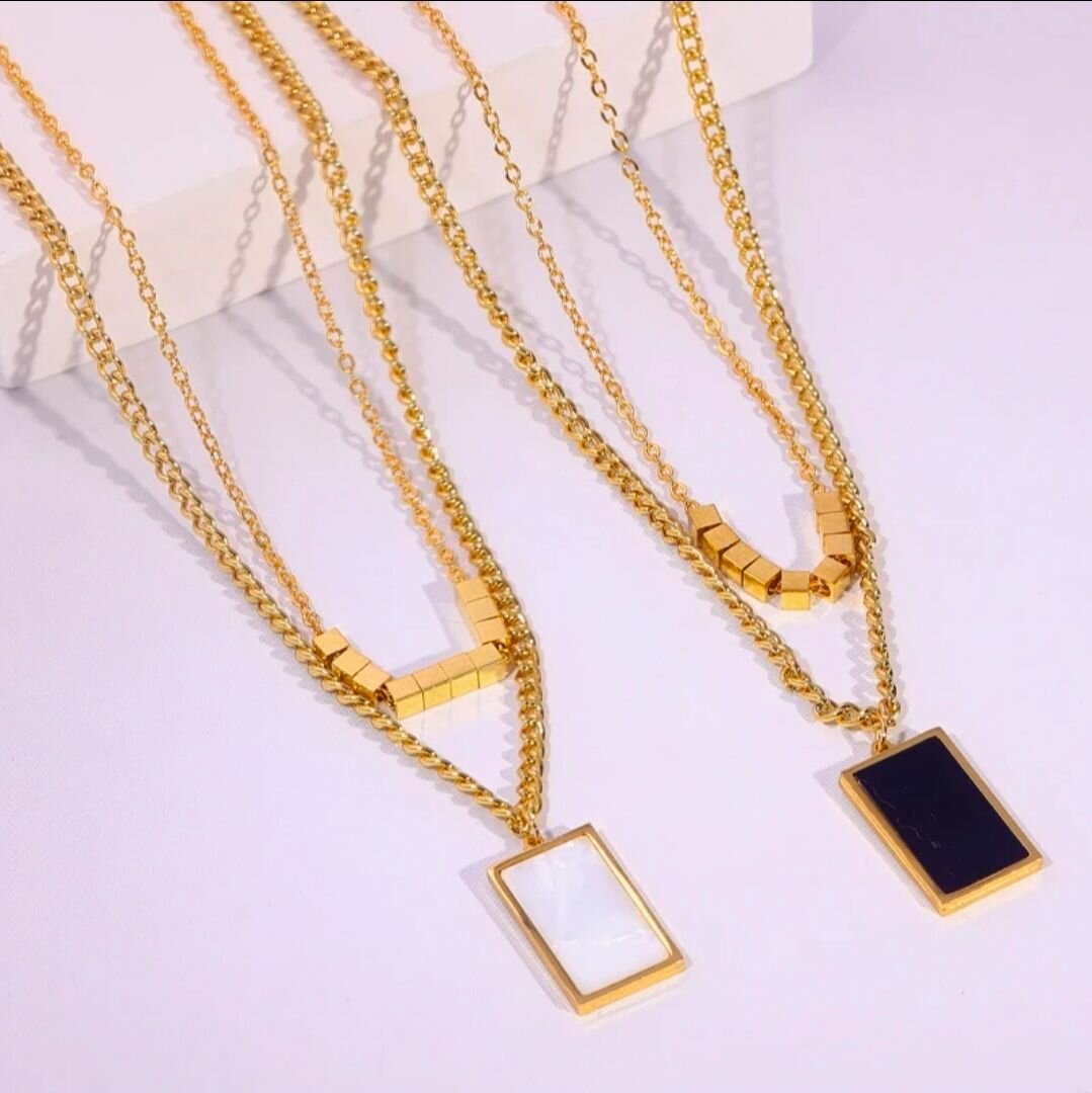 Discover the elegance of geometric pendant necklaces with a modern twist, perfect for any occasion. Crafted with high-quality materials, these layered gold chains feature distinct rectangular pendants in black and white, adding a touch of sophistication to your attire. Ideal for both casual and formal outfits, these necklaces make a stylish gift for yourself or a loved one.