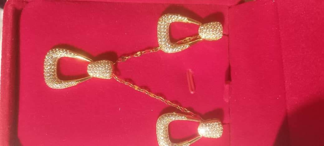 Sparkling elegant gold jewelry set with exquisite design perfect for special occasions. Crafted from high-quality materials, this set includes a beautiful necklace and matching earrings. Ideal for adding a touch of glamour to any outfit.