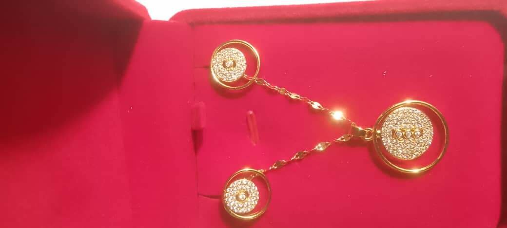 This stunning gold jewelry set features a matching necklace and earrings with intricate circular designs encrusted with sparkling stones. Perfect for special occasions or adding a touch of glamour to any outfit, this set will make you shine with elegance and style.