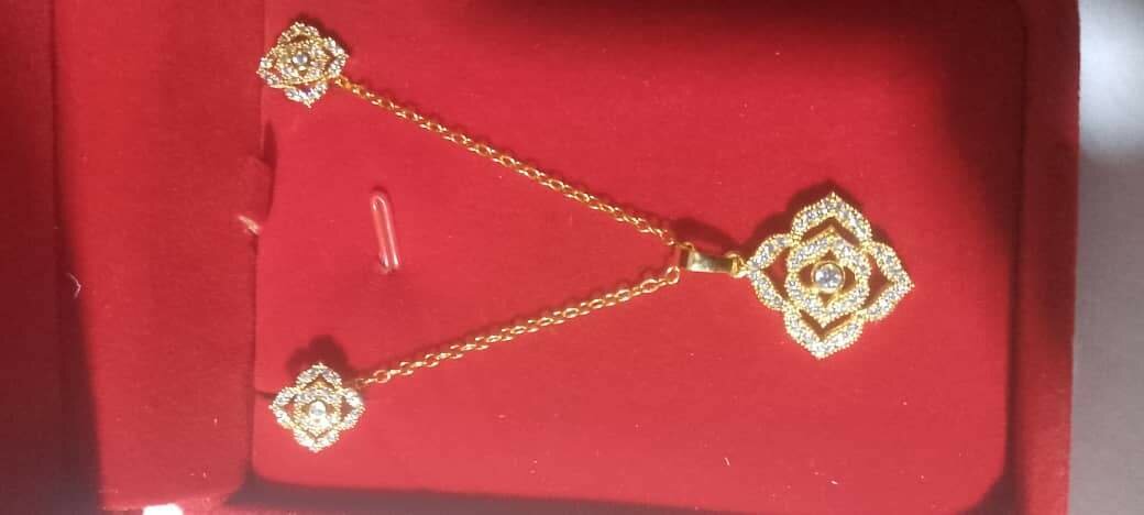 This exquisite gold necklace set features intricate floral designs with shimmering details, perfect for adding a touch of elegance to any outfit. Ideal for special occasions, this set enhances your beauty with a sophisticated sparkle. A perfect gift for loved ones or a treat for yourself!
