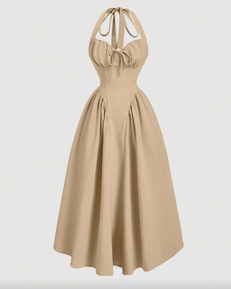 This stunning dress features a flattering halter neckline and flowing maxi skirt, perfect for special occasions. The elegant design and neutral tone make it suitable for weddings, evenings out, or any event where you want to impress. Crafted from high-quality materials for comfort and style.
