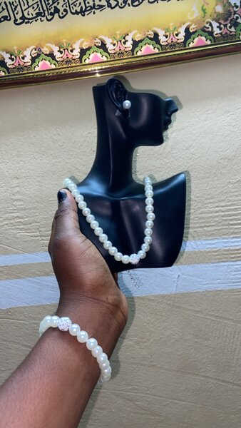 Discover elegance with this stunning pearl jewelry set featuring green gemstone accents. Perfect for formal events or adding a touch of class to any outfit. The set includes a necklace, bracelet, and earrings, offering a complete look. Ideal for weddings, parties, or gifting someone special.