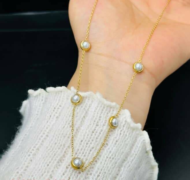 This elegant pearl necklace features delicate pearls set in a soft gold chain, perfect for adding a touch of sophistication to any outfit. Ideal for both casual and formal occasions, this necklace is a timeless addition to your jewelry collection. The design ensures comfort and durability, making it a charming gift for loved ones.