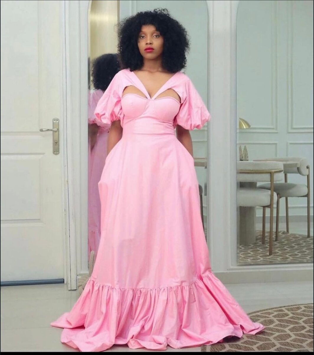 Cette élégante robe de soirée rose présente un charmant décolleté en cœur et des manches bouffantes pour un look romantique.