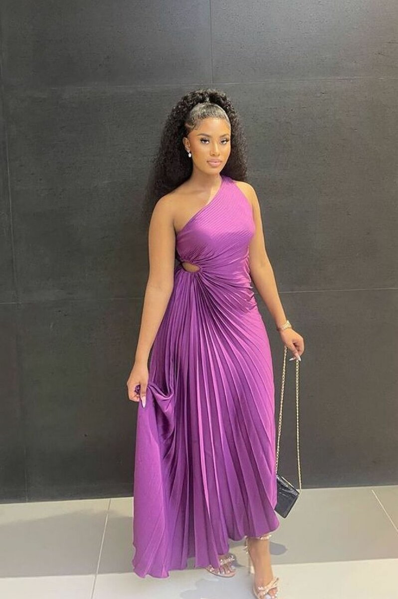 Turn heads with this stunning purple evening dress, featuring a trendy one-shoulder design and eye-catching pleats. Perfect for formal events and special occasions, its comfortable fit and stylish cut make it a must-have for your wardrobe.