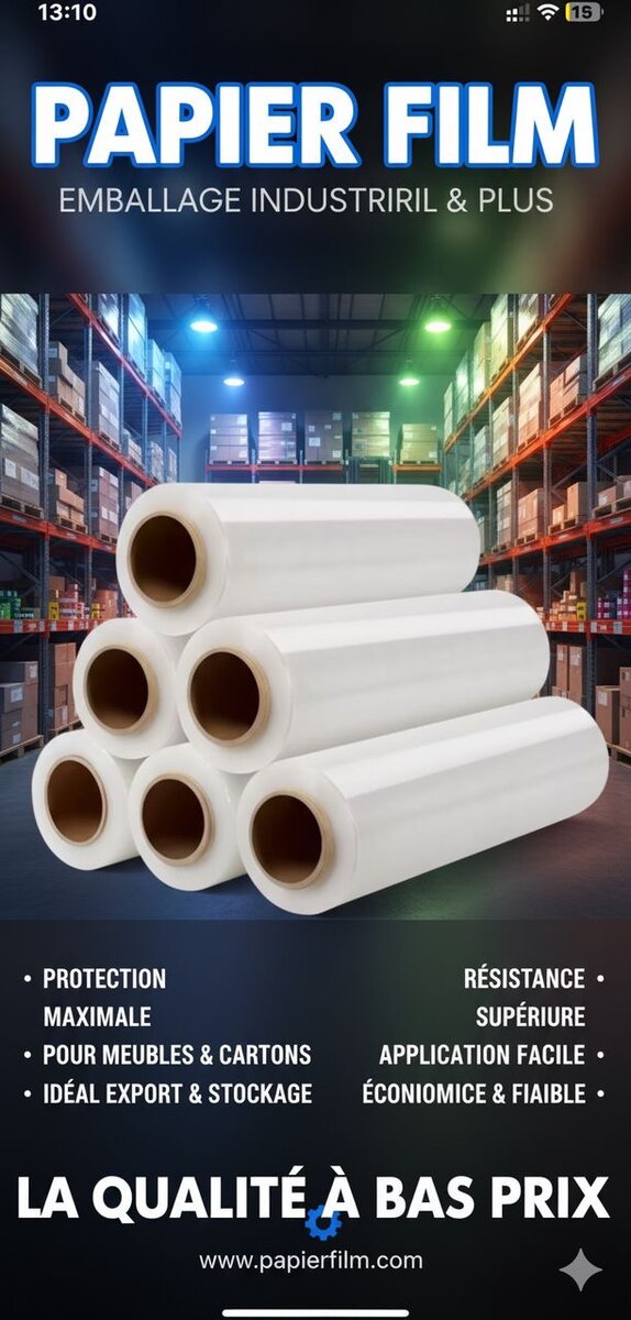 Film étirable industriel robuste pour protection optimale des meubles et cartons. Idéal pour export et stockage, facile à appliquer.