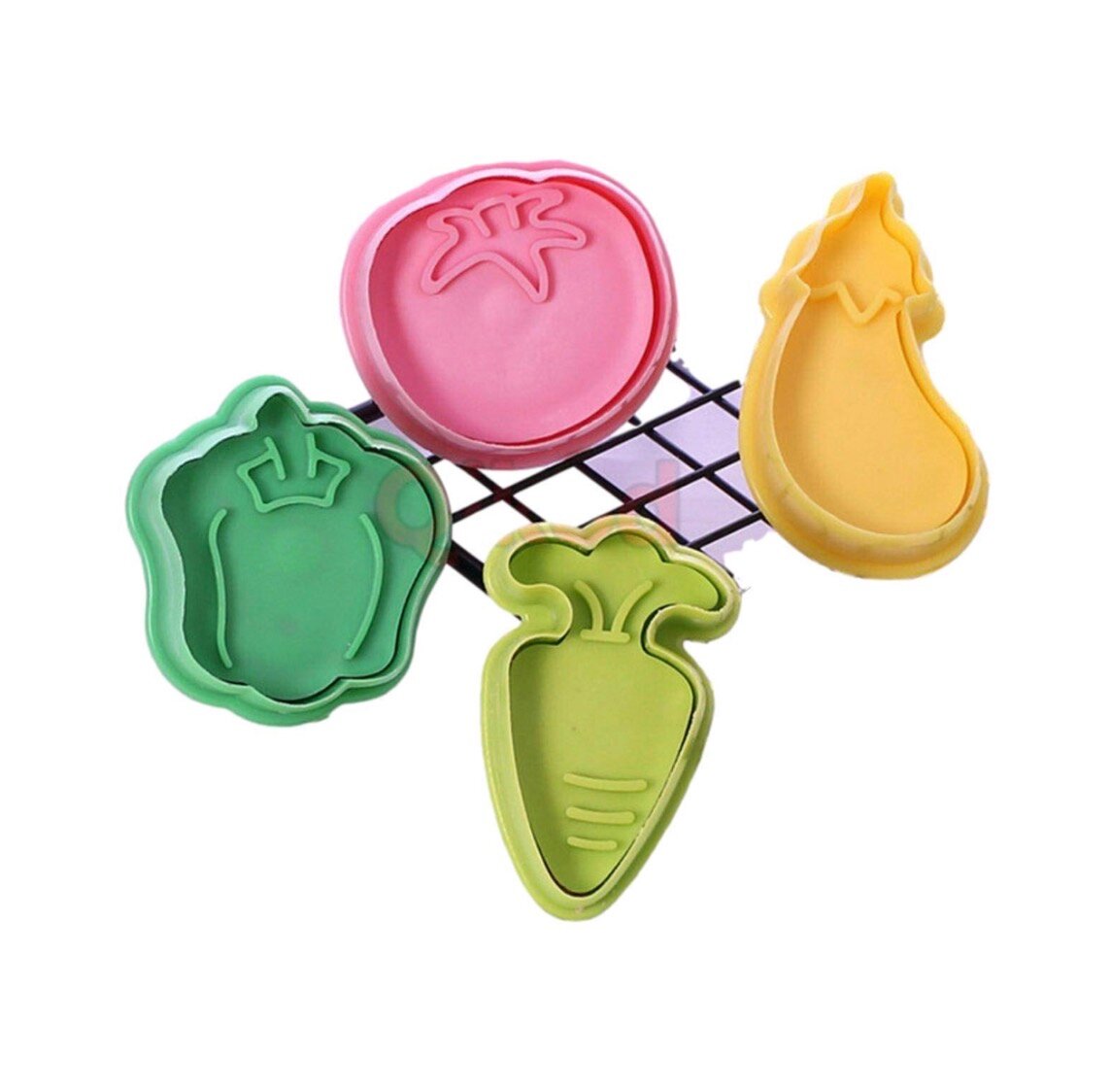 emporte-pièces pour légumes ou sandwichs, conçus pour découper des aliments ou de la pâte à modeler en formes de légumes (tomate, poivron, aubergine, carotte).