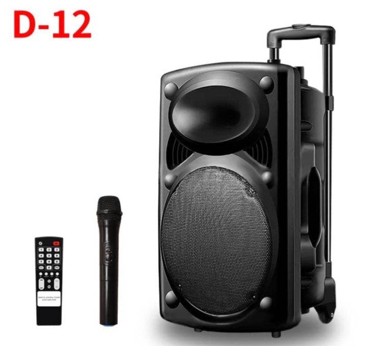 Profitez d'une qualité sonore puissante avec l'enceinte portable D-12, idéale pour les fêtes et événements. Inclus : microphone sans fil et télécommande pour un contrôle facile à distance. Facile à transporter grâce à la poignée télescopique.