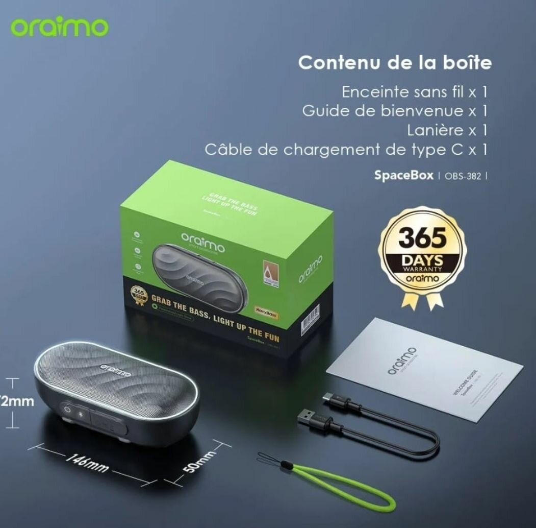 Profitez d'un son puissant avec cette enceinte sans fil Oraimo. Compacte et élégante, elle est parfaite pour la maison ou en déplacement. Charge rapide avec câble Type C et 365 jours de garantie. Idéale pour les amateurs de musique.