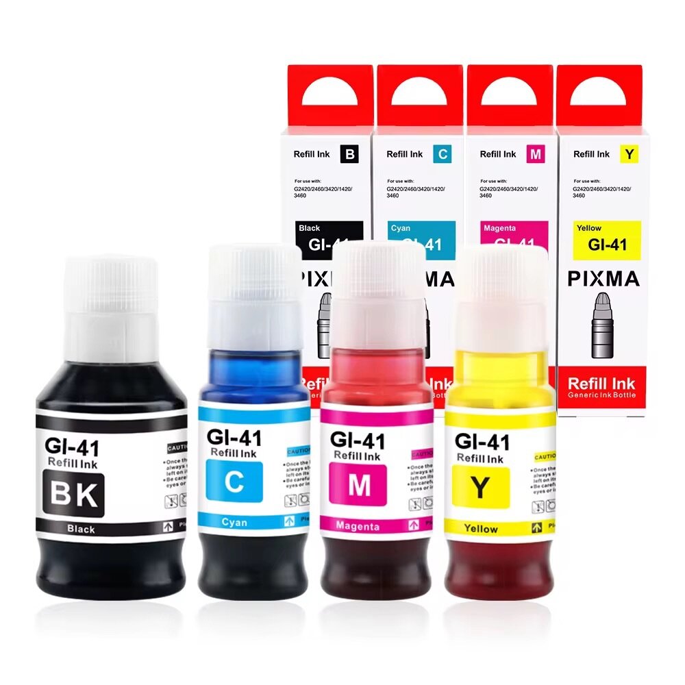 Encre de recharge GI-41 pour imprimantes Canon, idéal pour impression haute qualité. Bouchon anti-fuite et design facile à remplir. Disponible en noir, cyan, magenta et jaune pour répondre à tous vos besoins d'impression.
