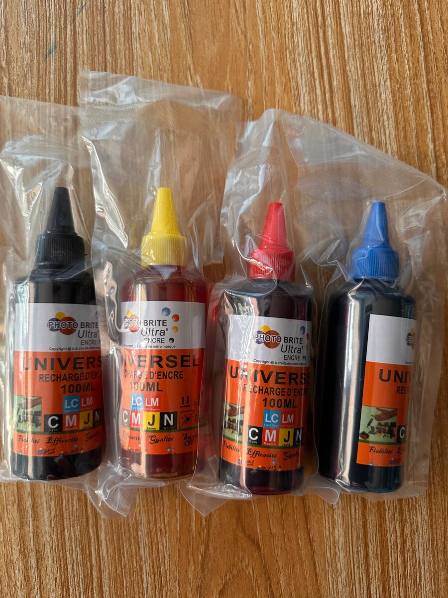 Encre universelle pour imprimante, lot de 4 couleurs : cyan, magenta, jaune et noir. Convient pour divers modèles d'imprimantes. Parfait pour des impressions de haute qualité et économiques à domicile ou au bureau.