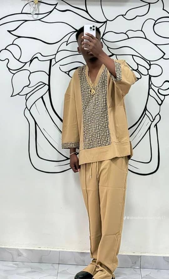 Optez pour cet ensemble africain élégant pour homme, parfait pour toutes occasions. Tissu léger avec motifs géométriques raffinés. Idéal pour cérémonies, sorties ou tenues décontractées.