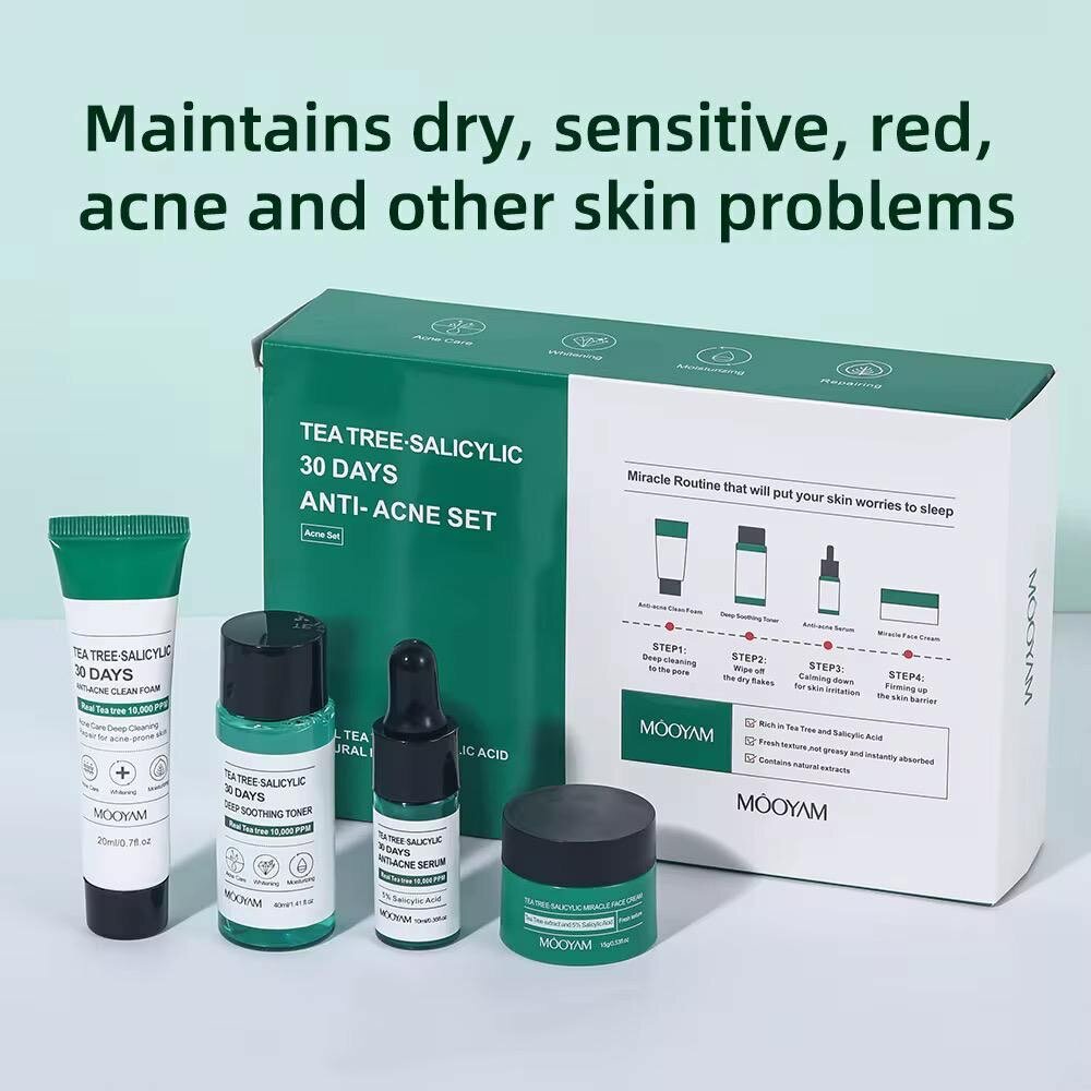 Découvrez l'ensemble anti-acné aux extraits d'arbre à thé et acide salicylique. Idéal pour traiter les peaux sèches, sensibles, rouges et acnéiques . Transformez votre routine de soin avec ce kit complet pour une peau éclatante et sans imperfections. Parfait pour un usage quotidien et tous types de peau.