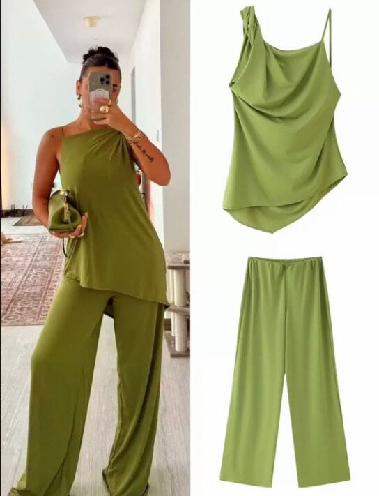 Optez pour cet ensemble vert élégant avec haut asymétrique et pantalon large pour un look sophistiqué et tendance. Idéal pour des événements décontractés ou des sorties estivales, ce set offre confort et style grâce à son design moderne et sa coupe flatteuse.