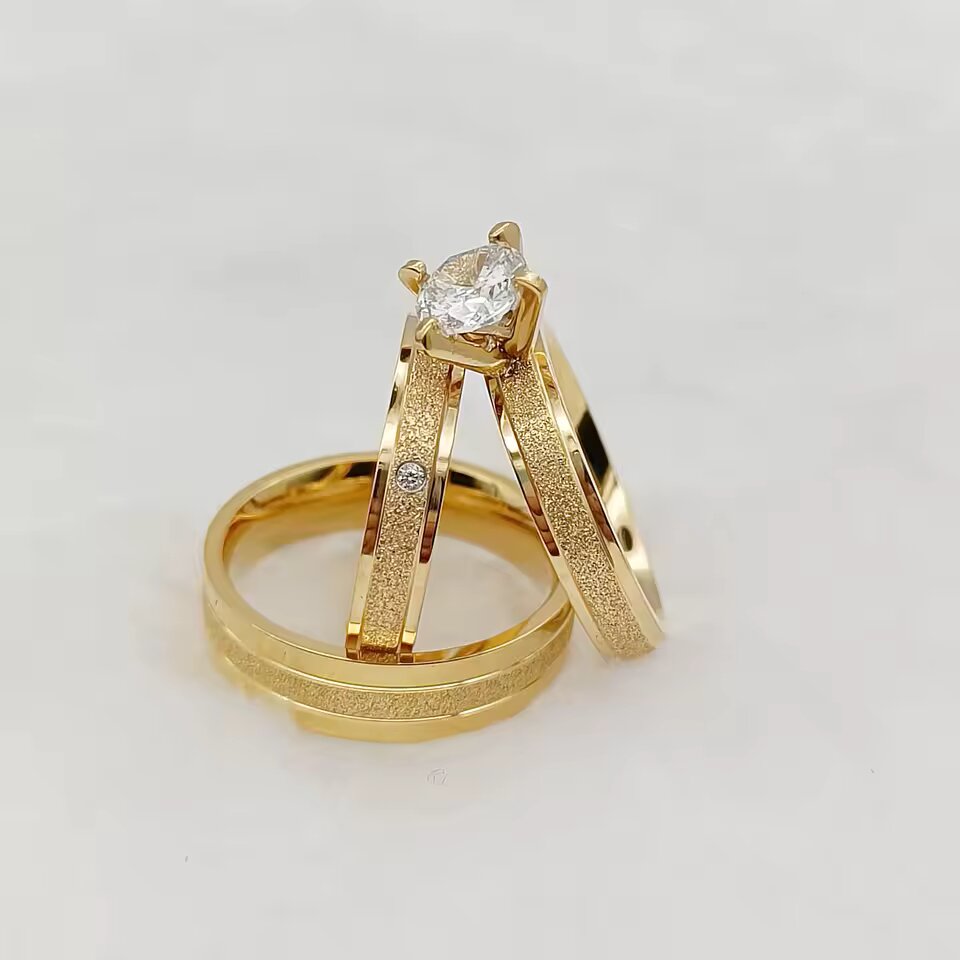 Élégant ensemble de bagues en or fin avec diamant central étincelant. Idéal pour célébrer des moments spéciaux ou comme alliances de mariage. Design raffiné et intemporel pour une touche de luxe.