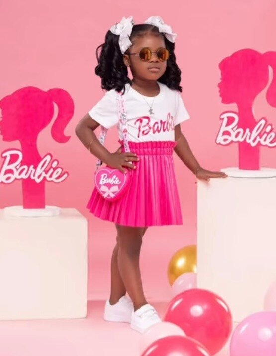 T-shirt Barbie, jupe plissée rose et sac à main en forme de cœur Barbie. Un ensemble idéal pour les fans de Barbie !