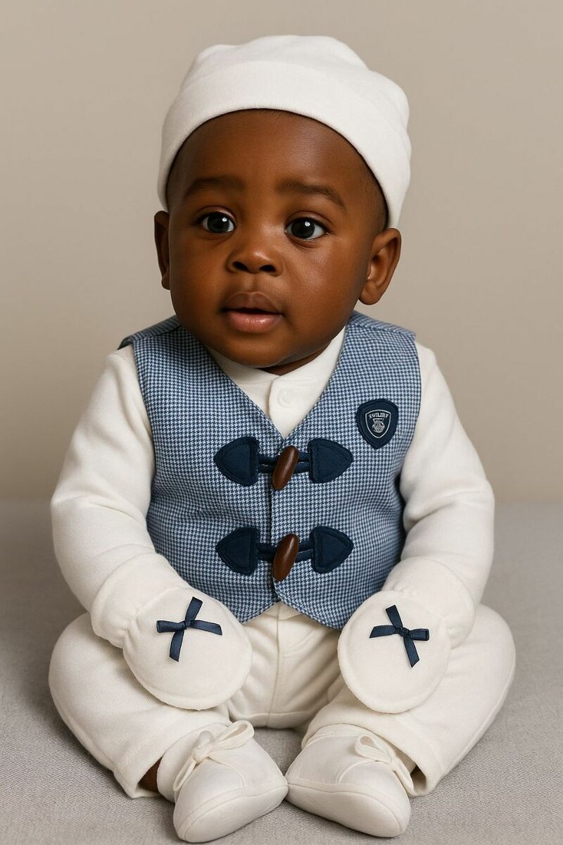 Ce magnifique ensemble bébé est parfait pour un look élégant et confortable. Comprenant un gilet en motif à carreaux, des gants avec détails ludiques, et un bonnet assorti, il est idéal pour toutes les occasions spéciales. Fabriqué avec des matériaux doux pour la peau délicate de votre bébé, cet ensemble offrira style et confort. Parfait pour des cérémonies ou comme cadeau de naissance.