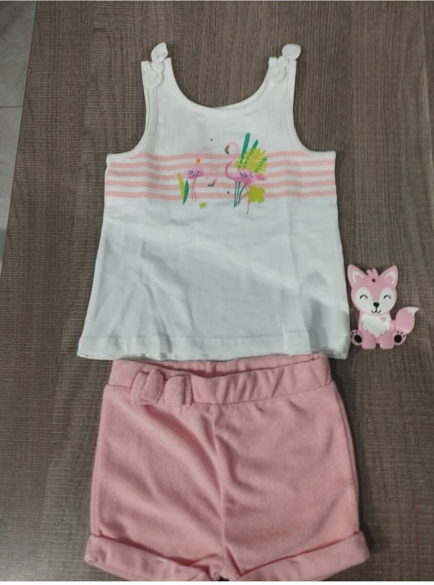 Craquez pour cet adorable ensemble Orchestra pour bébé fille, taille 9 mois. Composé d'un débardeur blanc illustré de flamants roses et d'un short rose assorti, ce set est parfait pour les journées ensoleillées. Confortable et stylé, c'est le choix idéal pour votre petite princesse cet été!. 9 mois