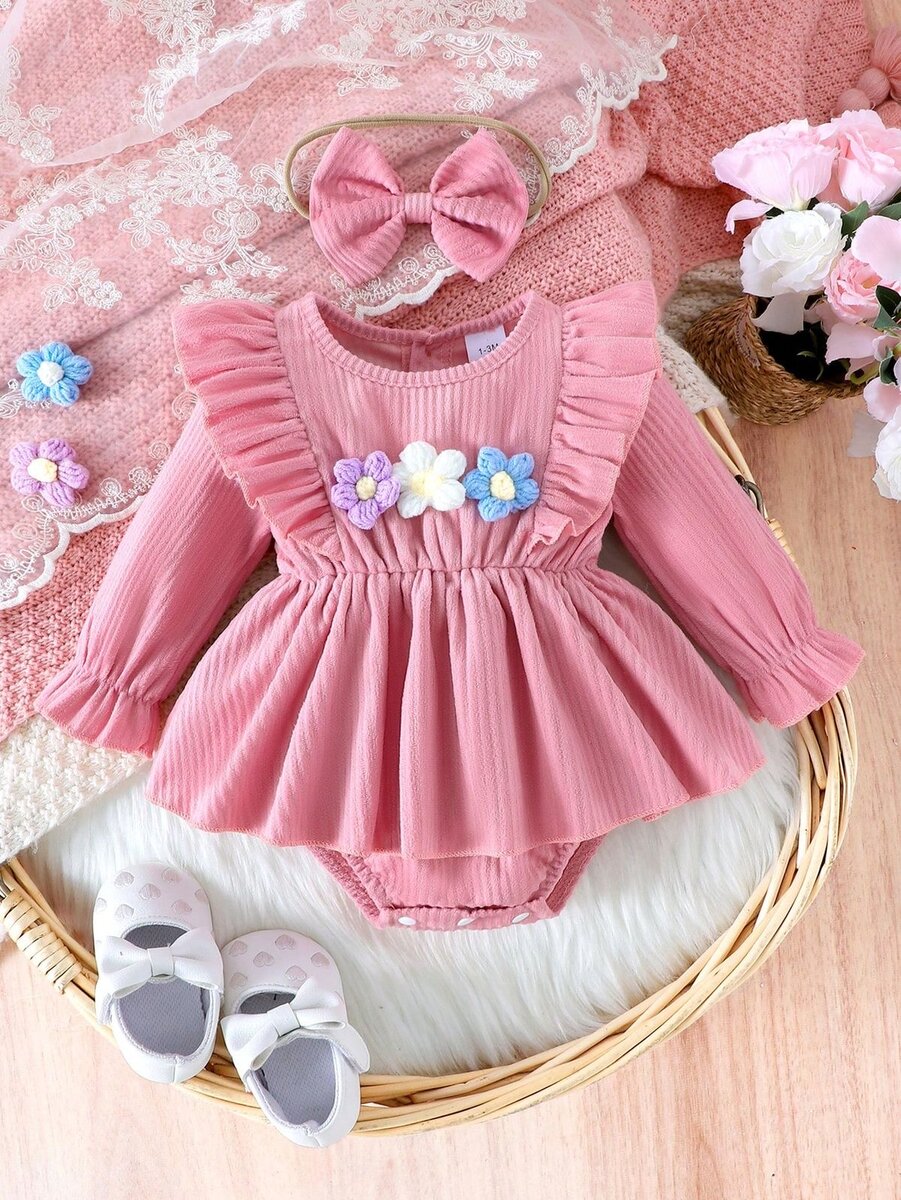 Ensemble bébé fille rose fleuri avec accessoires, idéal pour une occasion spéciale ou une sortie décontractée. Conçu pour les bébés filles, cet ensemble est à la fois mignon et confortable.