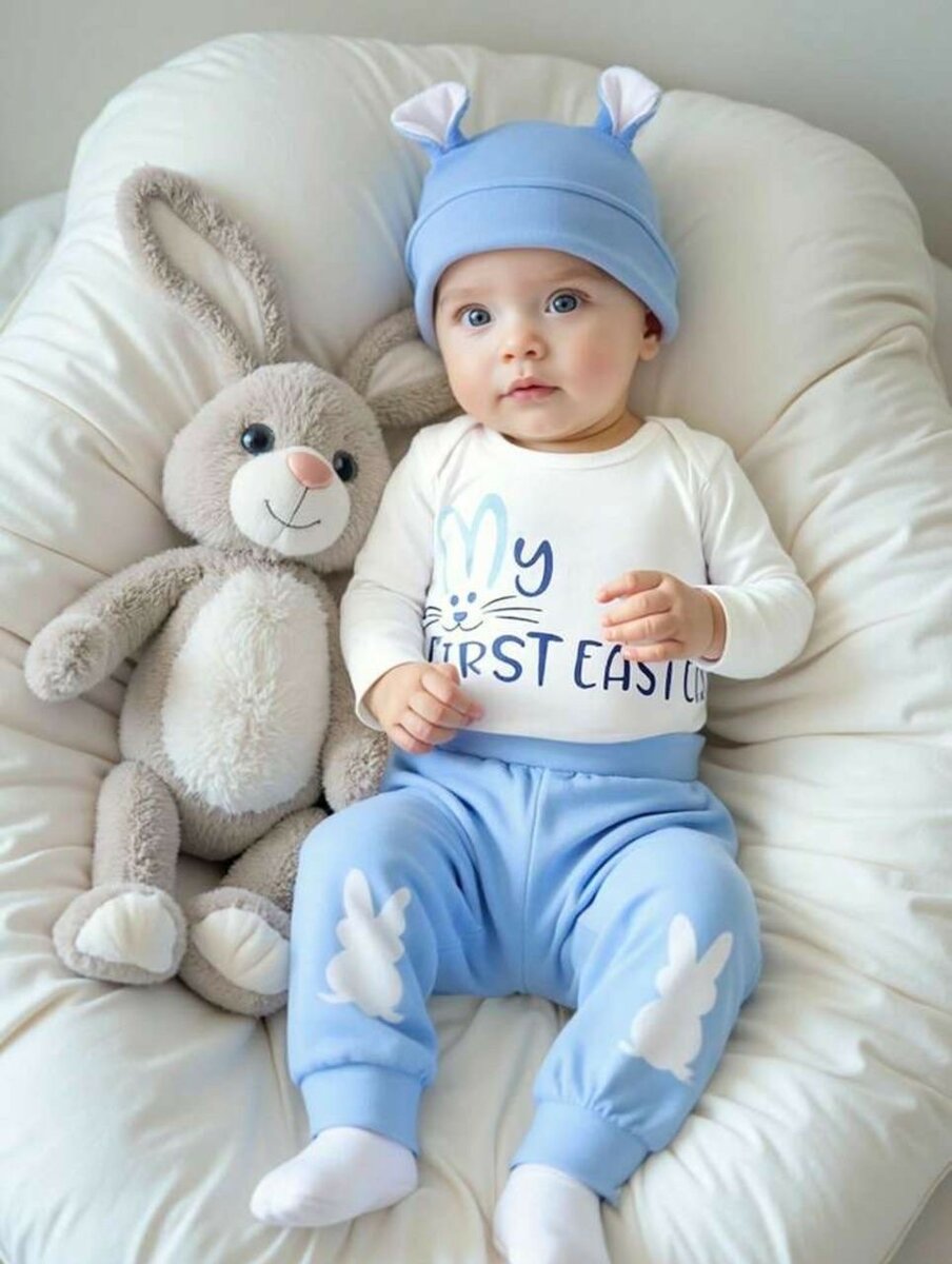 Adorable ensemble bébé pour célébrer la première Pâques. Comprend un body blanc avec motif lapin, un pantalon bleu avec détails lapin et un bonnet assorti. Confortable et doux, idéal pour prendre des photos mémorables. Parfait pour les tout-petits.