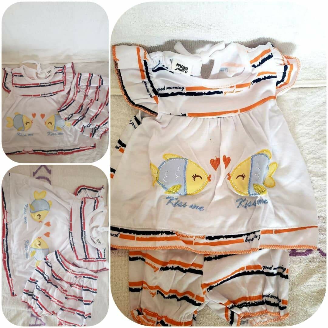 Adorable ensemble pour bébé avec motif poisson et petits cœurs. Parfait pour l'été, offrant confort et style à votre petit trésor. Idéal pour les sorties ou à la maison.