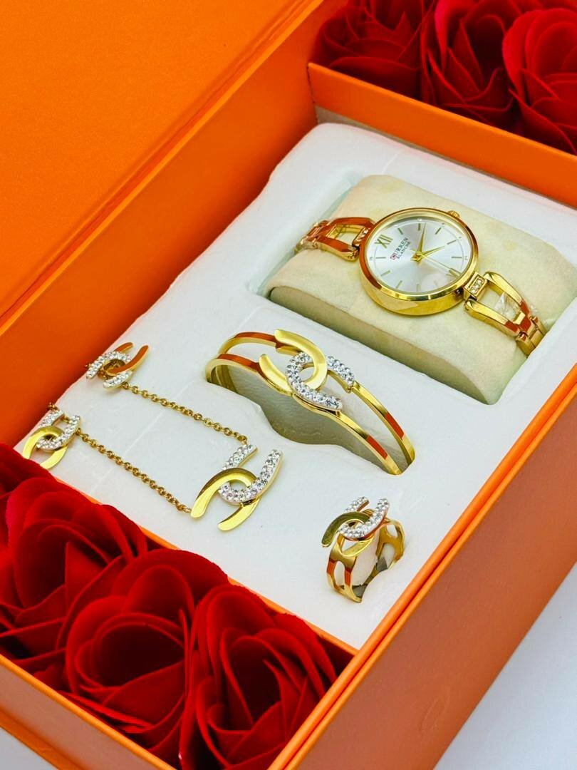 Magnifique ensemble de bijoux doré comprenant une montre élégante, un bracelet chic, une paire de boucles d'oreilles et un pendentif délicat. Idéal pour des occasions spéciales ou pour offrir en cadeau. Un choix parfait pour compléter votre tenue avec une touche de sophistication et de glamour.